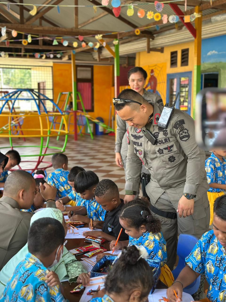 Di sela tugas patroli, personel menyempatkan diri berinteraksi langsung dengan anak-anak melalui kegiatan belajar dan bermain bersama. Suasana penuh keceriaan terlihat saat anak-anak mengikuti kegiatan menggambar, latihan baris-berbaris, hingga permainan edukatif yang dipandu oleh personel.